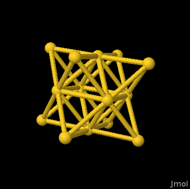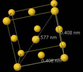 (NOTE: You can move the image by placing the mouse in the Jmol viewing window then clicking and hold the button down and moving the mouse.) Move the image around a little so you can see the cubic nature of the atoms. You might try to align the image so you can see what portion of a face-centered atom is inside the unit cell. To measure the distance between the two atom be sure the mouse is in the center of the first atom and double click the mouse (you may see the cursor change from an arrow to a cross), then move the mouse to the center of the adjacent atom and double click again. A distance in nanometer should appear along a dotted line between the two atoms. Here are a few extra images;
